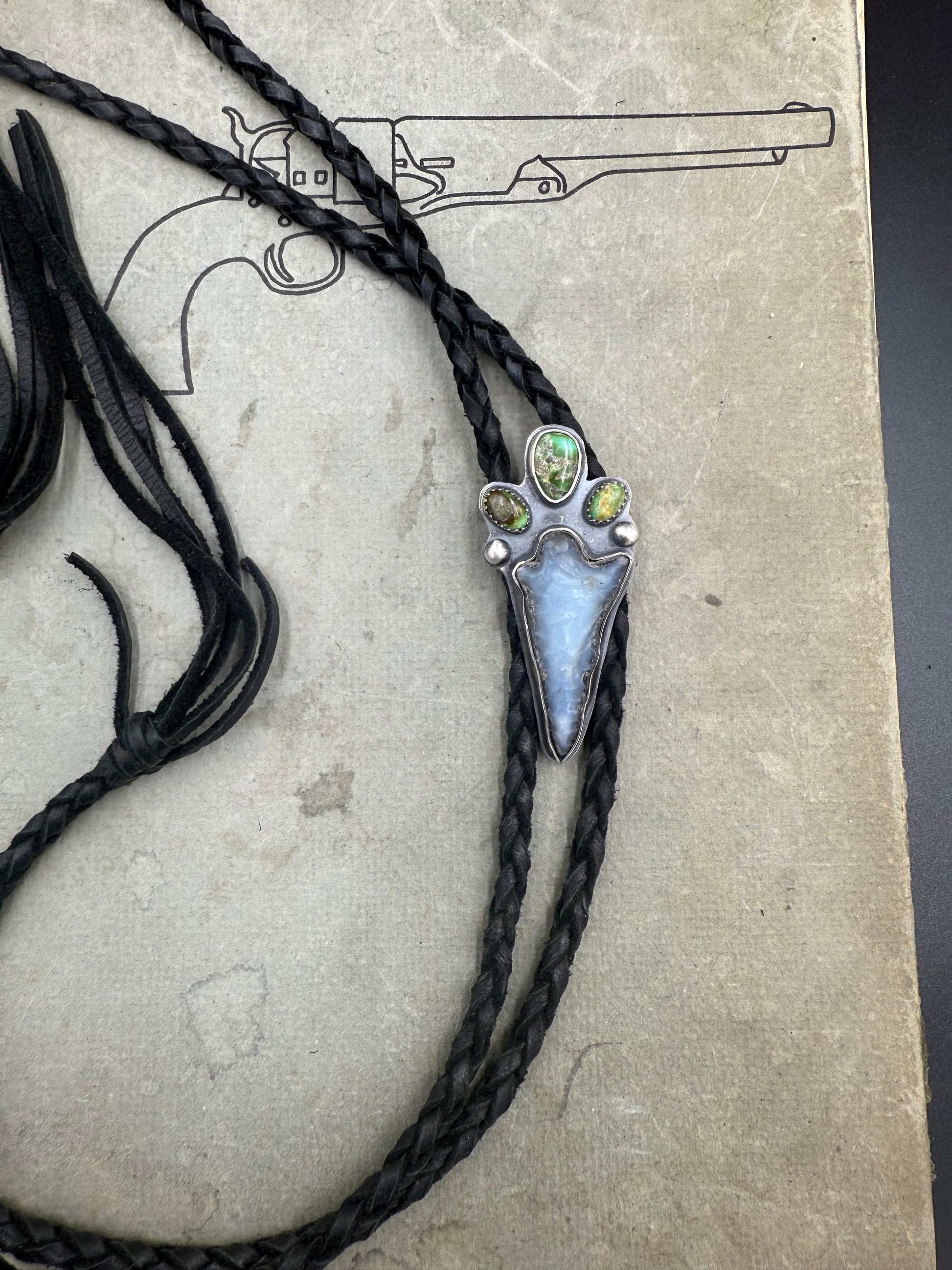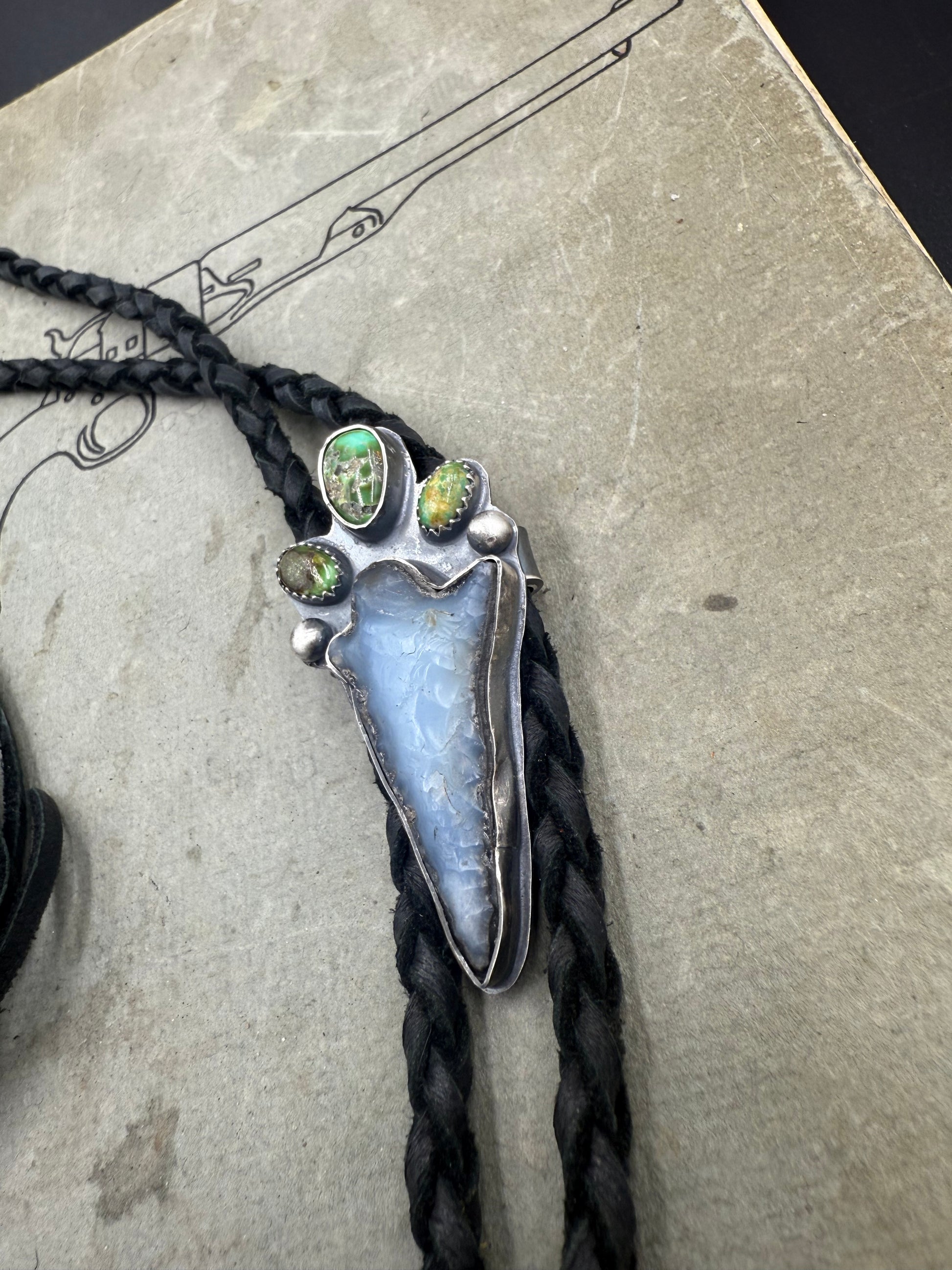 •features a RARE authentic hand craved white obsidian arrowhead and 3 high quality turquoise stones
