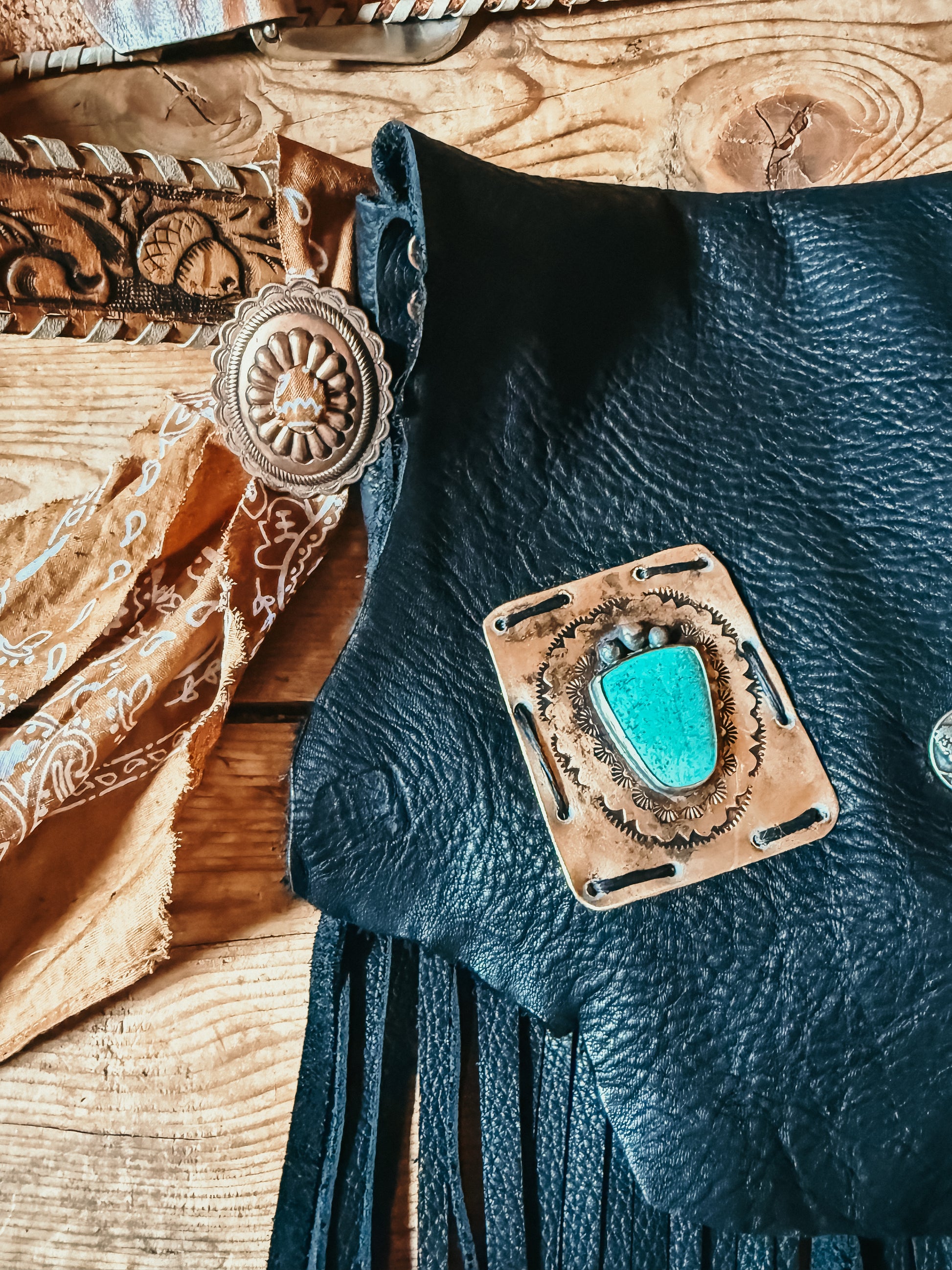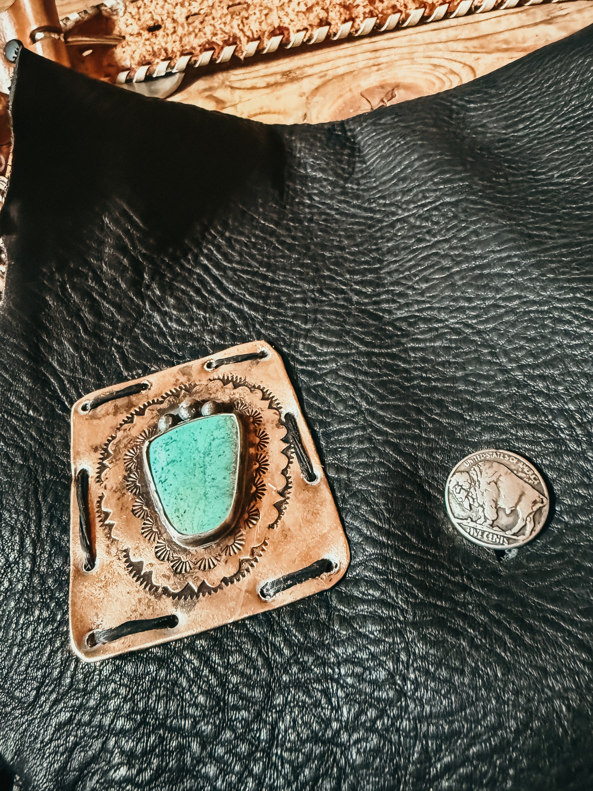 •features a hand stamped bronze patch with a high quality square turquoise stone and sterling silver details