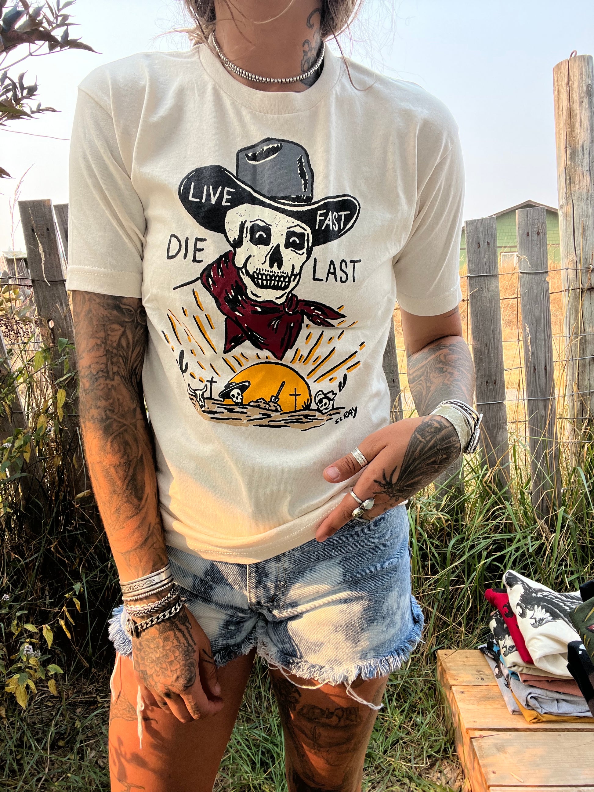 true to size custom live fast die last design by el ray design on a MADE IN USA brand new tee classic tan color